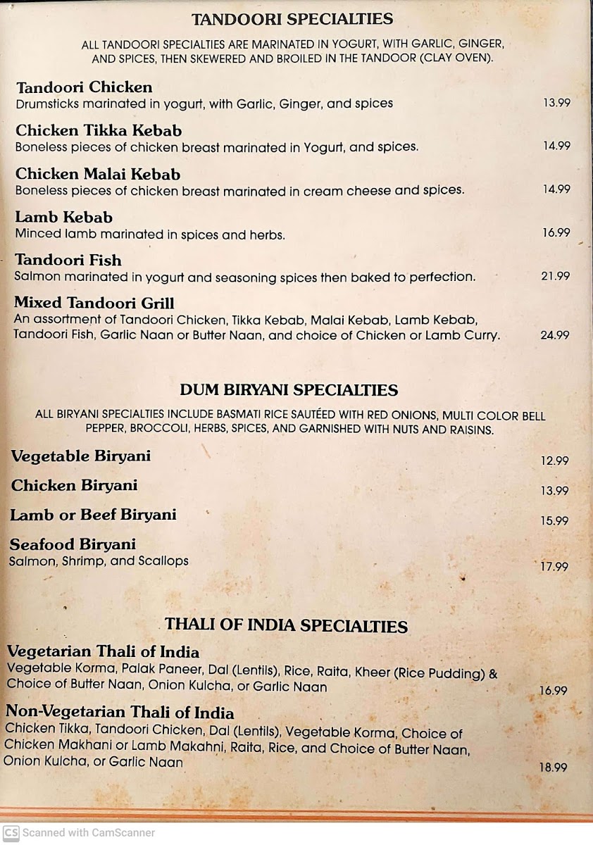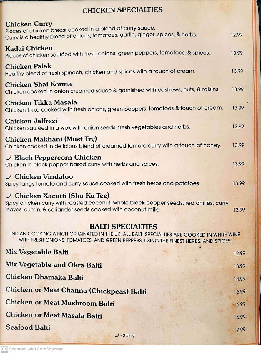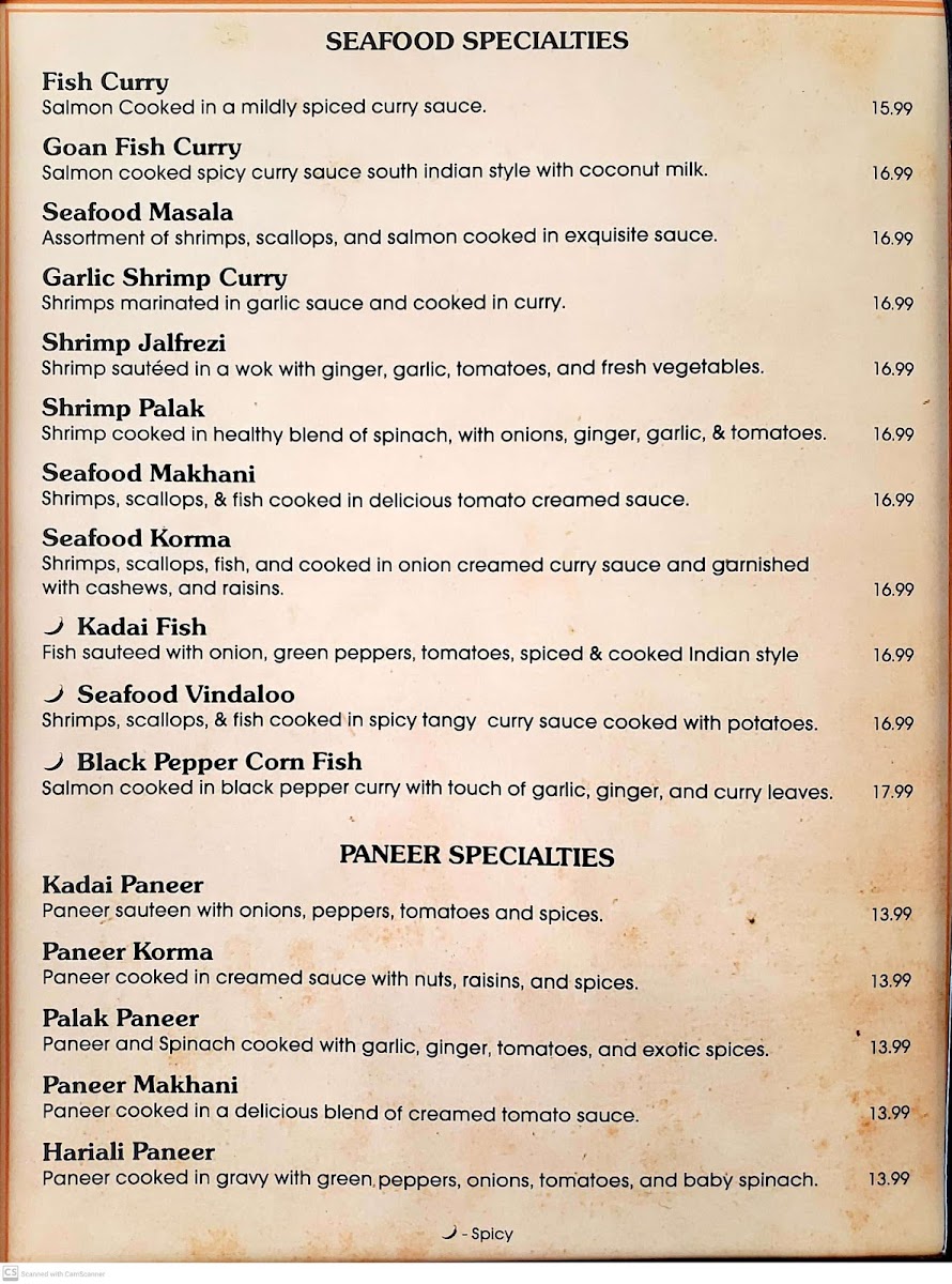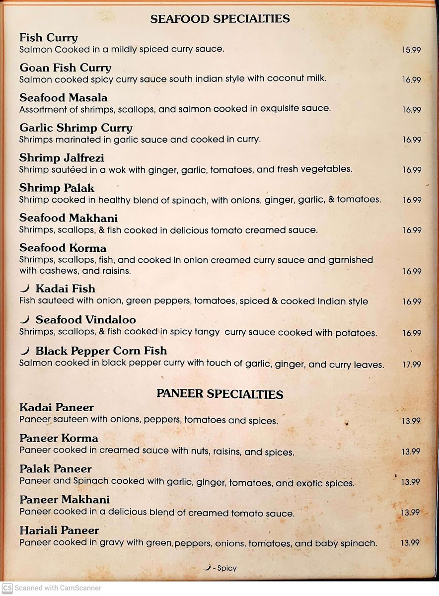 Saag with choice of protein, including fish, paneer, seafood, and more. Spice levels range from mild to extra hot.